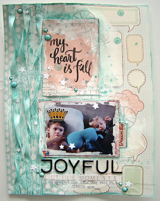 I used my sewing machine and stitched a strip of paper down the left hand side. For the embellishments I used some older October Afternoon and Maggie Holmes. Last, I scattered sequins across the page and adhered them with Glossy Accents.